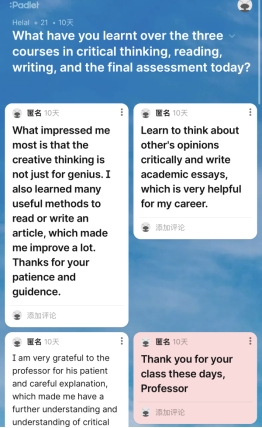 In the last lecture of the two professors, our students were reluctant to part and said that they had gained a lot. On the one hand, they believe that the development of such activities is very important for the improvement of my scientific research accomplishment and academic growth. On the other hand, they also express their heartfelt thanks to the teachers of our college, the project teachers and the two professors for their careful and hard work!