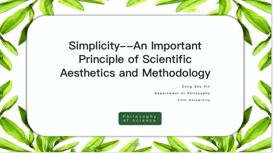 In addition, it also improves my ability of English expression and communication. I gradually realized that the real significance of philosophy of science and technology is to solve practical problems in real life and provide intelligent solutions for the benefit of mankind. Besides,science and technology are not cold things. They are related to aesthetic values. This is also the greatest driving force for scientists to constantly make new scientific and technological inventions and theoretical discoveries, which is the pursuit of beauty.I am very delighted to have a deeper understanding and research of my favorite field of scientific aesthetics under the guidance of the professor, and to tell my understanding of simplicity in scientific aesthetics in the presentation of the final examination.