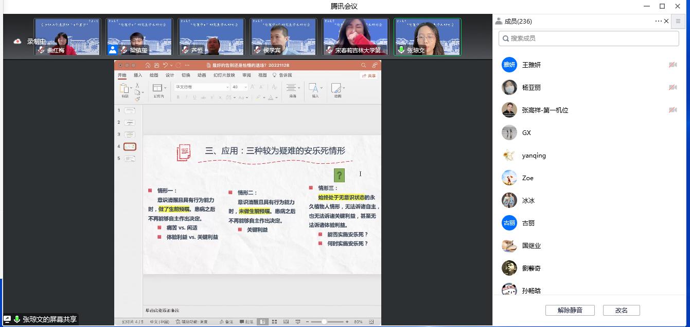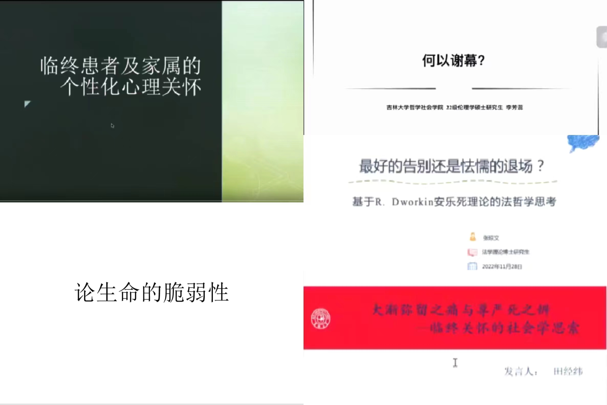 、“伦理学+”研究生学科交叉融合学术交流分中心开展的2022年研究生学科交叉融合学术活动第二十二期“生命的脆弱性与拯救——‘临终关怀’主题跨学科研讨会”在线上举办,研讨会吸引了二百三十余名校内外观众共同参与,反响热烈。
