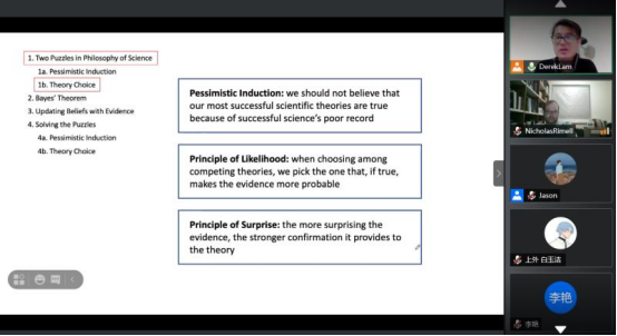 林尚德老师在第一堂课上介绍了在哲学中使用概率的概念,并提出了科学技术哲学的两个难题——悲观归纳法和理论选择,并着重介绍了贝叶斯定理,用证据更新信念,由此佐证了概率论在哲学学习和研究的重要作用;第二堂课上,教授介绍了概率的概念,以及概率作为频率的三种具体情况——实际频率、频率极限和假设的频率;第三堂课讲授的是信度的概率,老师依次举例论证了次要素质、信仰与信仰程度、主观主义、客观贝叶斯主义和悖论,由此得出了概率论在科学发展进程的重要作用。
