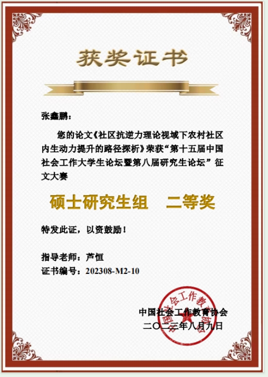 2022级社会工作专业硕士生张鑫鹏同学荣获硕士研究生组二等奖。