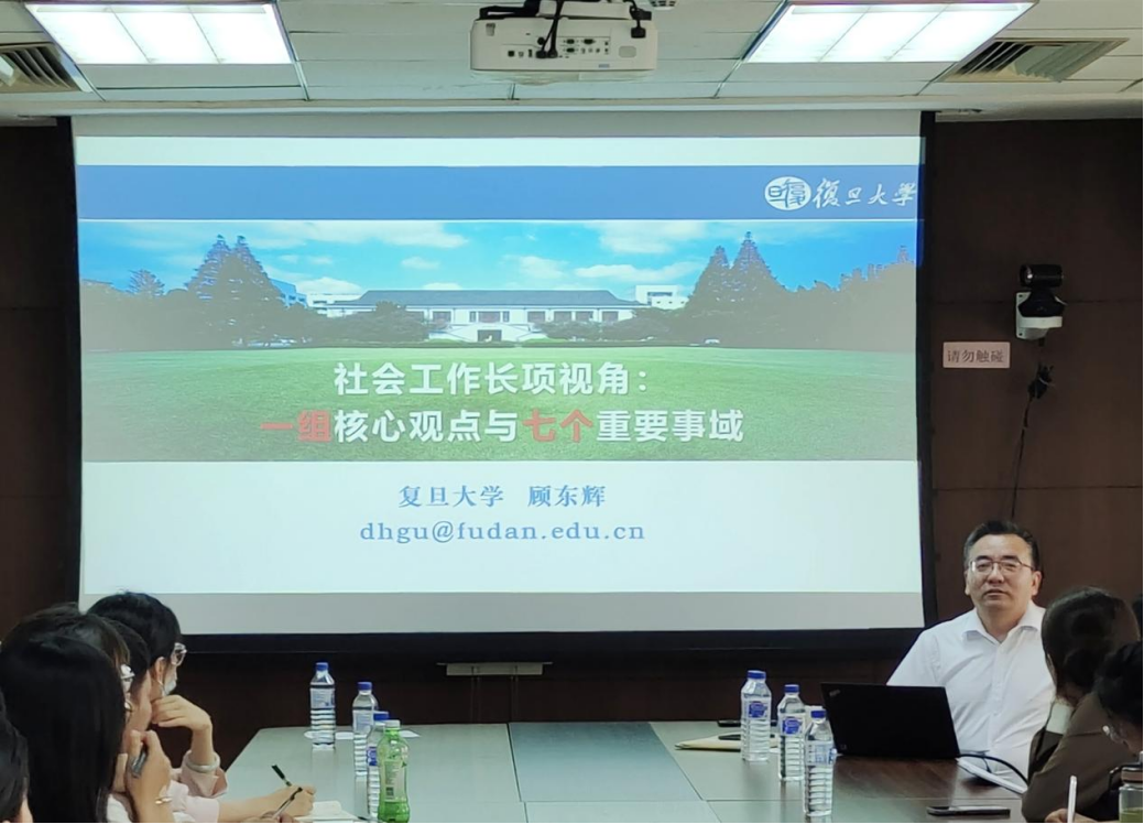 名家系列讲座”第185场在东荣大厦A904会议室成功举行。本期讲座由中国社会工作教育协会副会长,中国社会工作学会副会长,民政部国家社会工作专业人才培训(复旦大学)基地主任,复旦大学社会发展与公共政策学院(社会工作学系)的顾东辉教授主讲,讲座题为《社会工作长项视角:一组核心观点和七个重要事域》。本次讲座由副院长芦恒教授主持,田毅鹏教授、贾玉娇教授、秦振兴博士等多位教师参加了本次讲座。