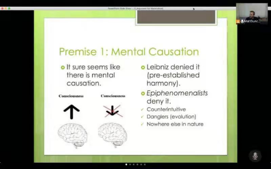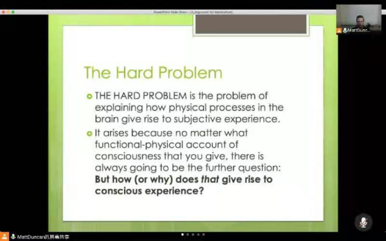 第二部分讲授了The hard problem of consciousness。在该部分Duncan介绍了意识问题真正困难的部分:经验问题。对意识的解释并不简单局限于对认知和行为功能的解释,意识问题的焦点在于为什么认知和行为的执行会伴随经验,在功能和经验之间存在着解释的差距,经验是超越单纯的物理过程的。
