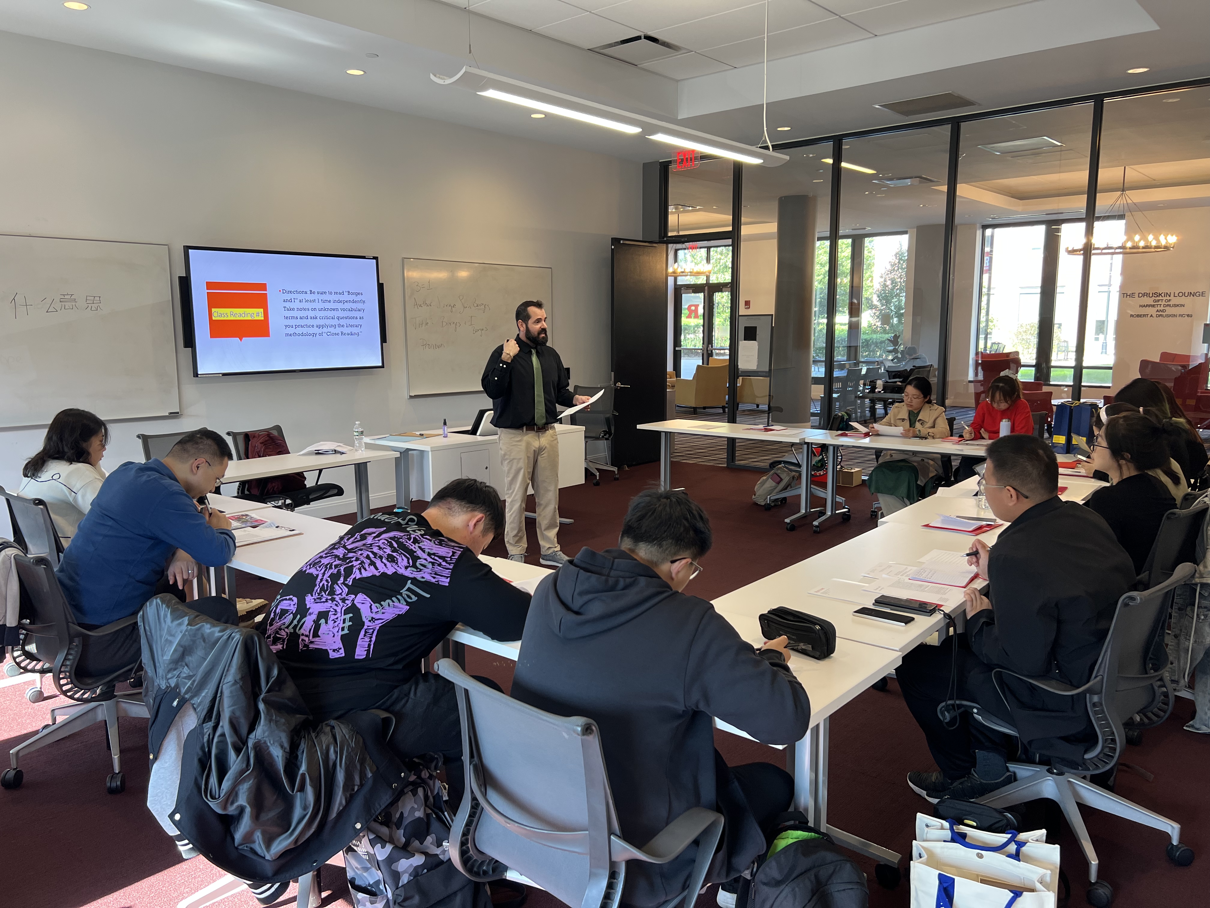 第一堂课是Christopher Rivera教授的学术英语工作坊第一讲。课堂上,教授就比喻语言、字面语言、象征等写作方法进行了详细讲述,教会同学们分析句中的五要素,并带领同学们进行了精读训练。