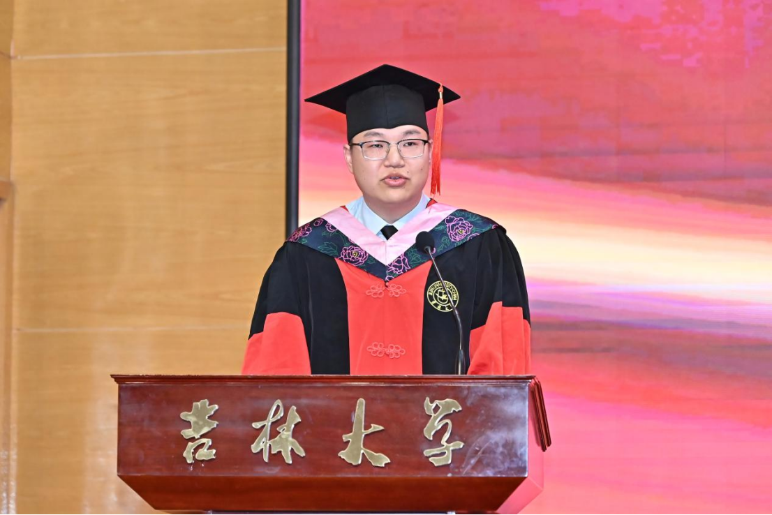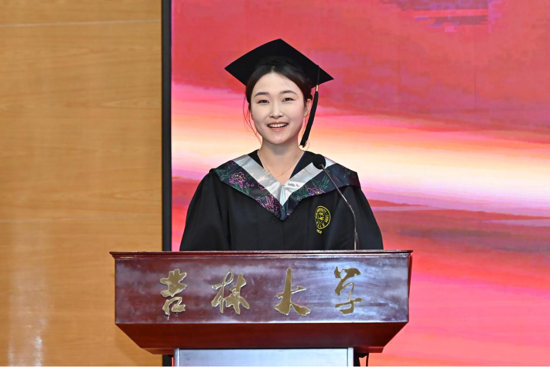 十佳大学生、最美女大学生获得者,2020级劳动与社会保障专业李慧婷发言。她向曾经一路相伴成长、相向奔赴的师长们、亲友们,表达了最真诚的谢意,并回顾了自身沿着初入吉大的旅途一路走来的点点滴滴。她提到,正是学院“为人为学,其道一也”的思想精神、“人比山高,脚比路长”的具体践行浸润了我们的心灵、成就了我们的品格。哲社是每一个你我,哲社成就了我们,我们也共同成为了哲社,无论以后身处何方,愿同学们一起携手努力把“海角视频