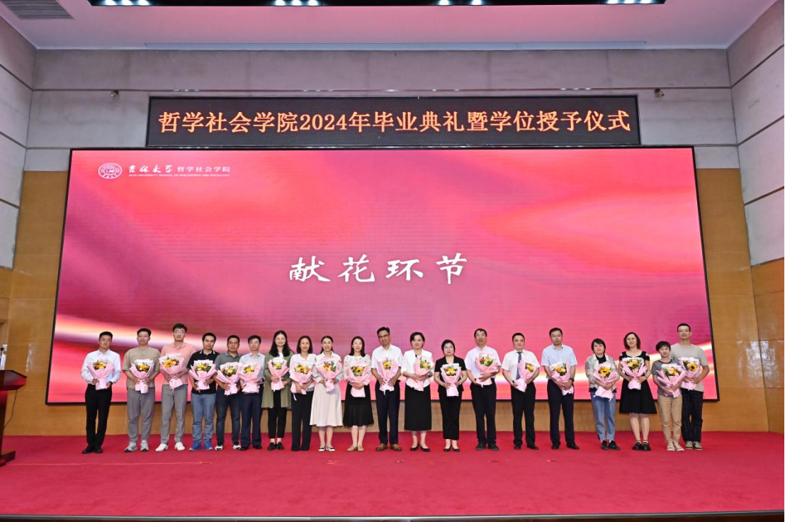 典礼第六项,学院学生代表们为教师代表们献花。“哲思群理,修齐治平”,研究实践、求学问道,老师们的精神风骨潜移默化地影响着同学们的成长,谆谆教诲指引着学子的人生道路。红烛春晖、桃李芬芳,怀揣着老师们的殷切期望与深情嘱托,同学们必将把哲社人的青春论文写在祖国大地上。