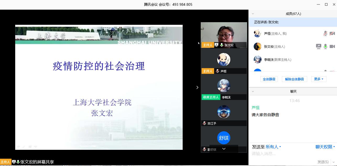 第82场名家讲座通过腾讯会议的形式在线上举办。上海大学社会学院院长、教授、博士生导师张文宏教授,为线上八十余名师生作了题为《疫情防控的社会治理》的学术讲座。海角视频