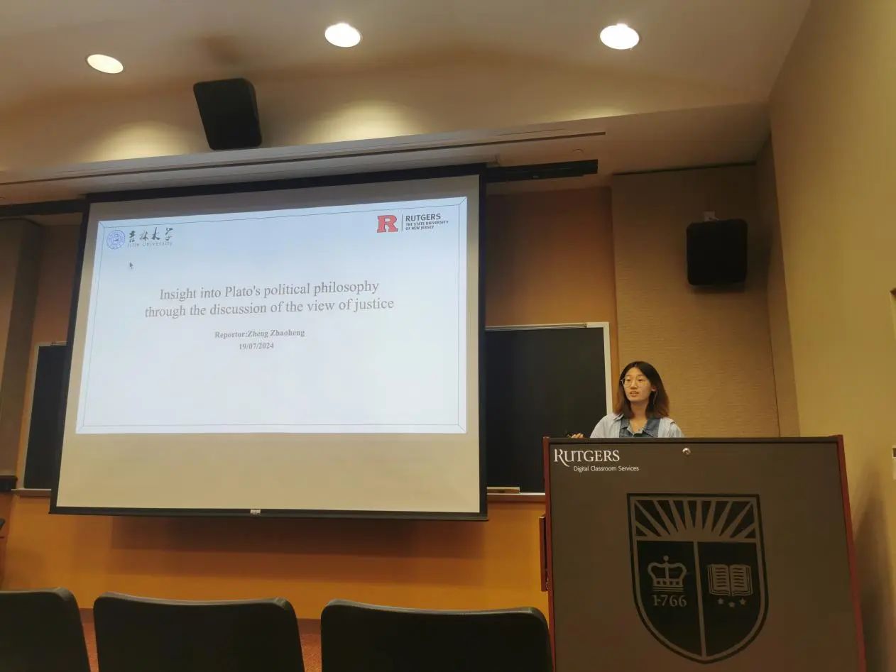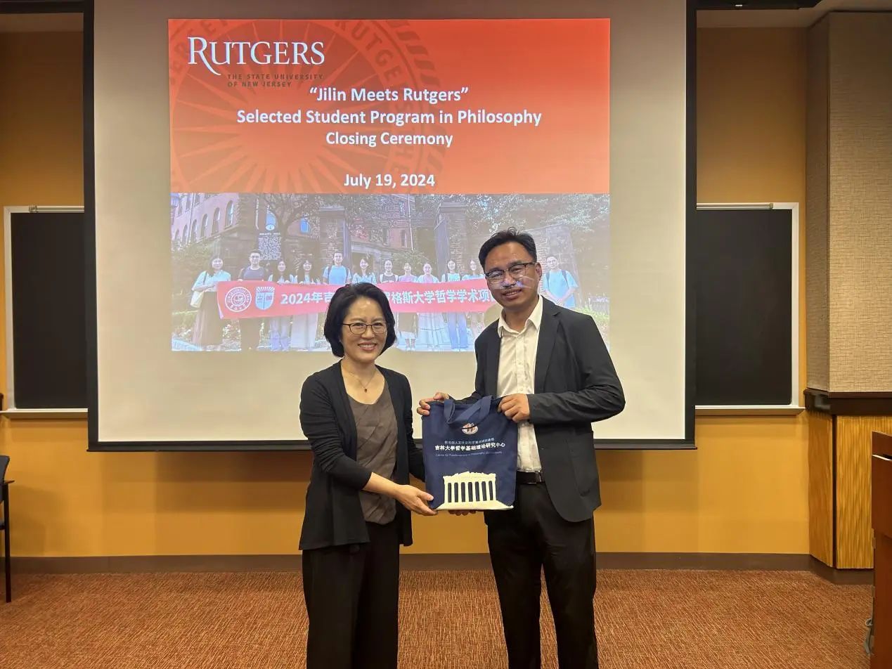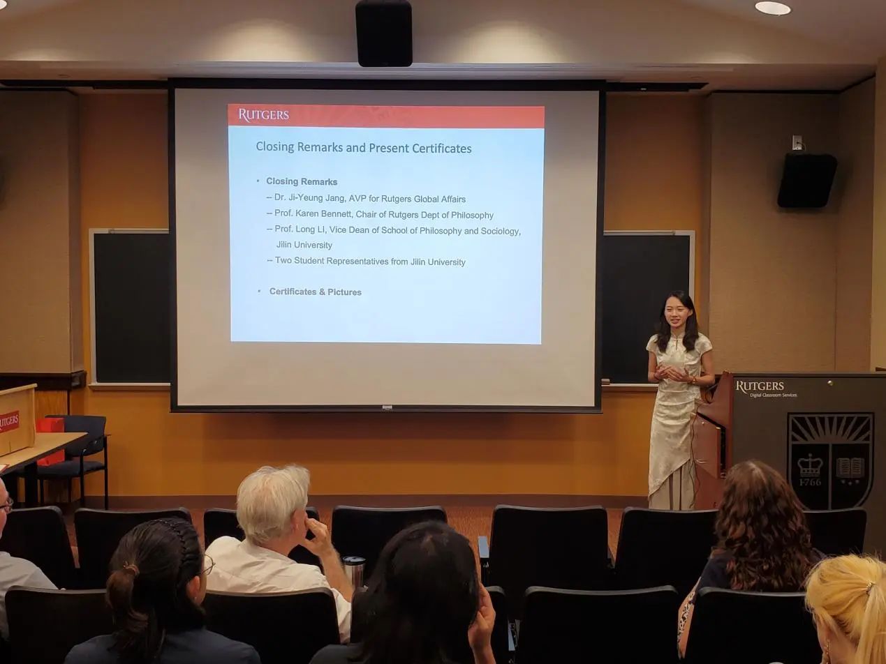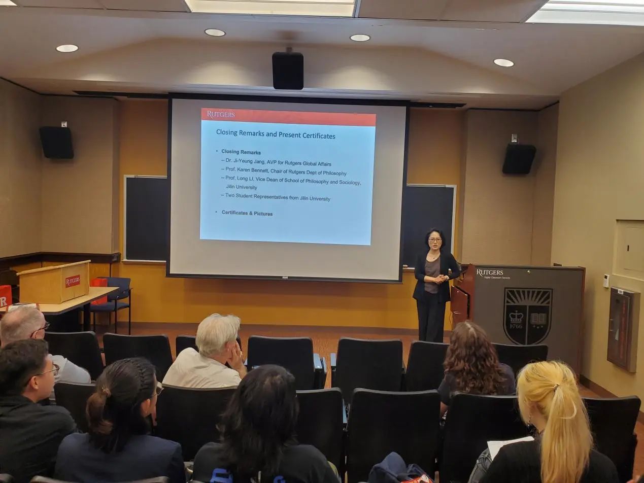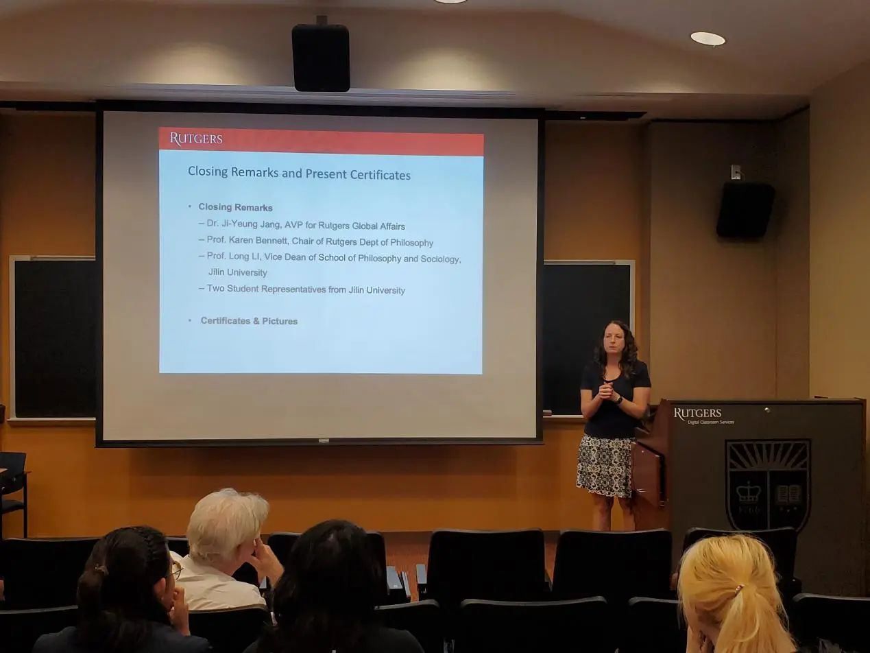罗格斯大学哲学系系主任Karen Bennett教授和哲学系的Michael Glanzberg教授、Trip McCrossin教授对同学们的结业展示进行了点评与提问,并提出建议。三位教授都对同学们的表现给予了肯定与赞许,表示同学们的表现超乎了预期。接着,两校师生在轻松愉快的氛围下共同观看了由罗格斯大学国际处制作的“Jilin Meets Rutgers”哲学暑期学校的总结视频。