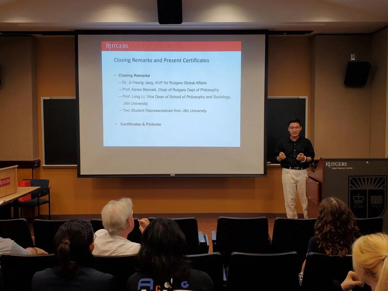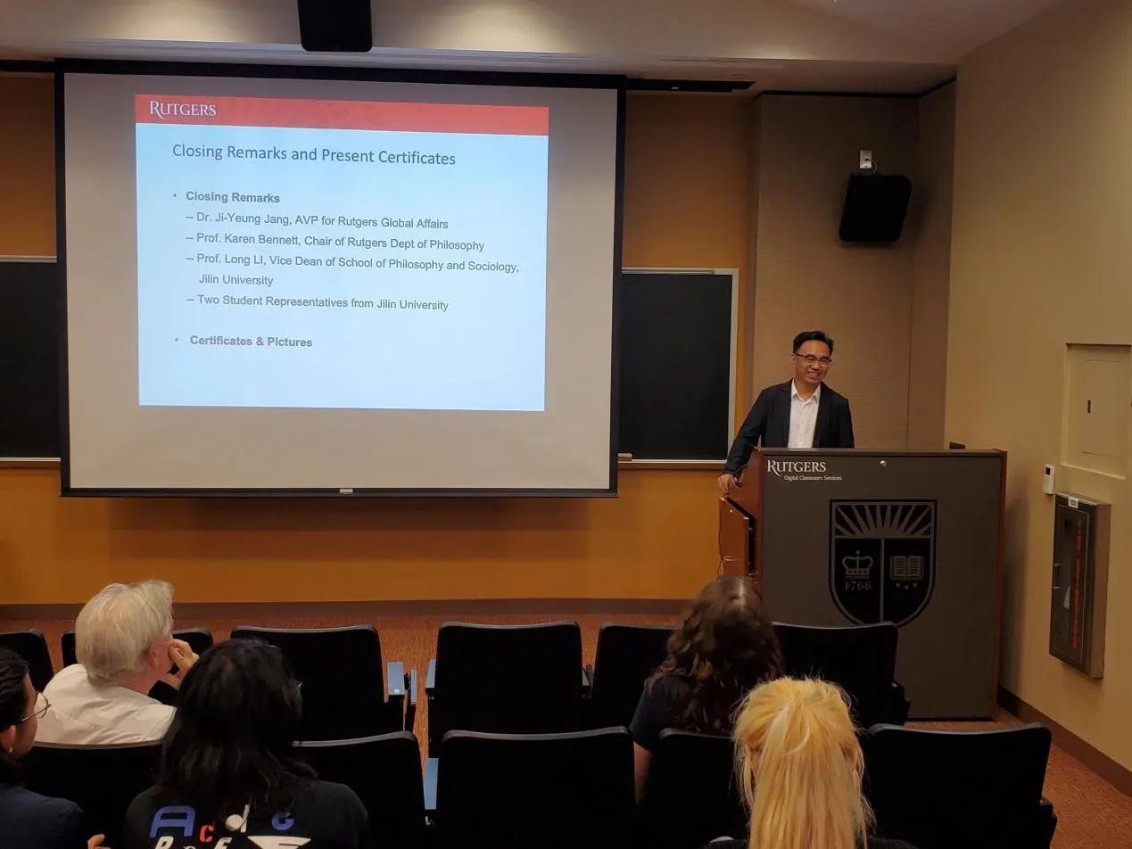 对罗格斯大学表达了感谢,特别是对罗格斯大学副校长Eric (Rick) Garfunkel、罗格斯大学全球事务助理副校长Ji-Yeung Jang博士、罗格斯大学哲学系系主任Karen Bennett教授、哲学系各位教授,以及Shuman Wen老师表示感谢,他们为本次暑期活动付出了巨大的努力。李龙教授还表达了对同学们的欣慰和自豪,并为未来同罗格斯大学的合作进行了展望,同时邀请罗格斯大学哲学系的老师访问海角视频