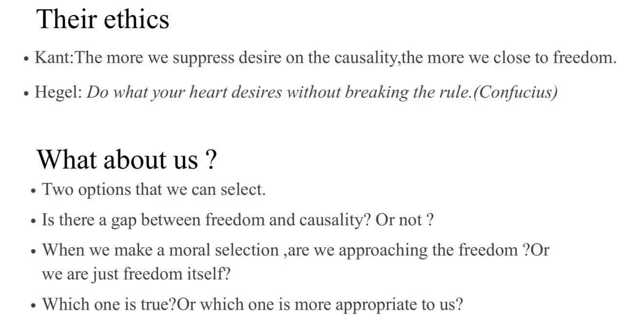 本次汇报针对“自由与因果的关系”问题展开,集中探讨了康德与黑格尔对该问题的不同的伦理学观点,并发掘其伦理学背后的形而上学基础,对二者的形而上学特征进行分析,关注其差异性与连续性,由此解释二者在伦理学上的差异与连续性,从而达到对该问题更深刻的理解。在汇报的结尾,闫禹衡同学将该问题落实到现实生活中,探讨了“人应当超越因果关系从而达到自由”还是“人本身作为自由的精神实体而存在”的问题。