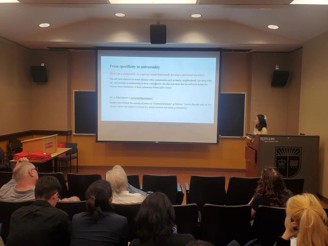 本次汇报以麦金太尔的共同体思想、亚里士多德的实践智慧与赫斯特豪斯的伦理学思想为核心,探讨了广义的美德伦理学应对道德相对主义指控的路径。她指出,美德伦理学的发展未来在于行为者本身调动理性与德性的能力,在于概貌性科学的实践。美德伦理学为道德原则的调整提供了条件和空间,同时保留了面向人类善的基本框架。