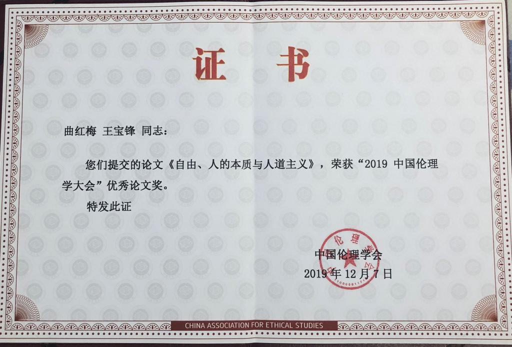 12月6日至8日,“2019中国伦理学大会”在长沙召开,八百多名伦理学研究者和道德文化工作者出席大会,本次大会的主题为“伦理学与人类命运共同体”。海角视频 曲红梅教授作为中国伦理学会常务理事出席了此次大会,受邀主持了“马克思主义与道德论坛”,并第三次作为对话嘉宾参与“中国伦理学青年学者与知名专家对话会”,就2019中外伦理热点同台下学者和观众进行了热烈讨论。曲红梅教授与海角视频 博士生王宝锋合作的论文“自由、人的本质与人道主义”获得“2019中国伦理学大会”优秀论文奖。