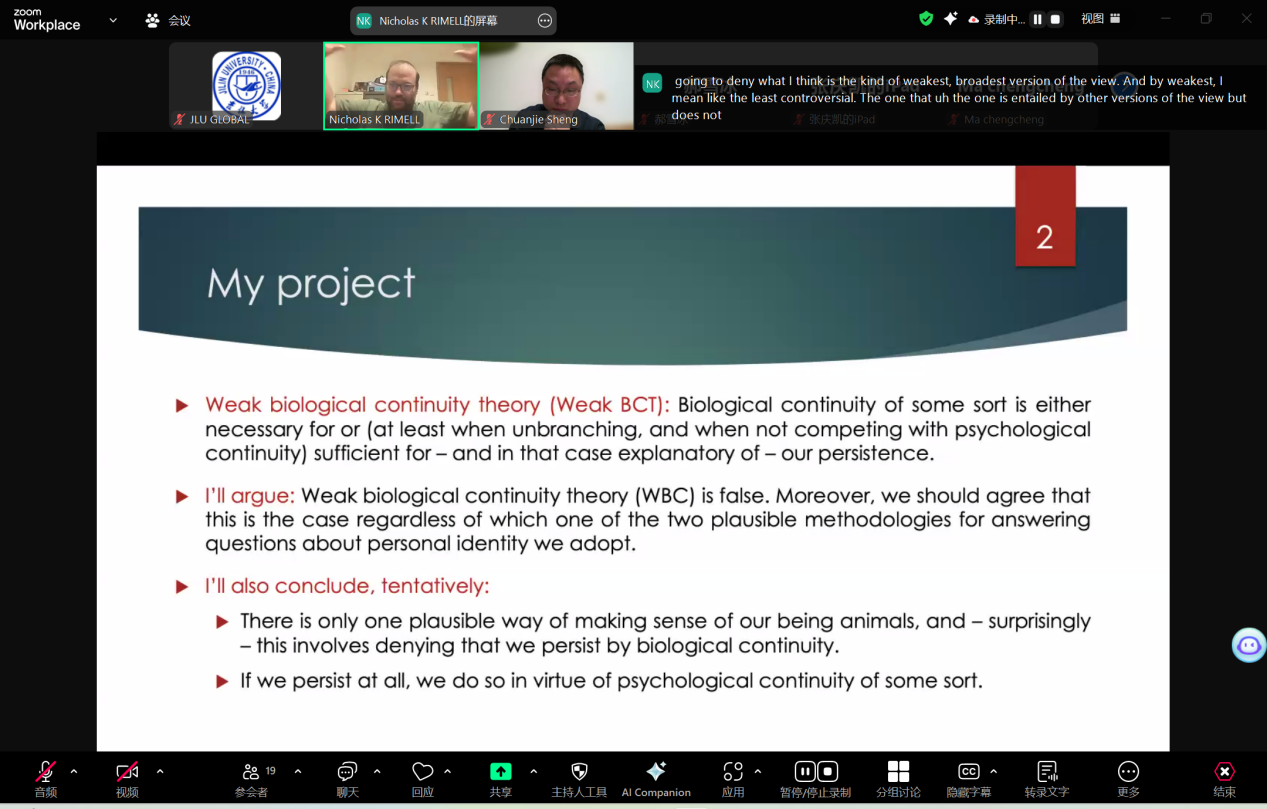 “国际合作平台学术讲座”第48讲——“Biological Continuity Accounts of Personal Identity”(生物连续性视角下的个人身份)在线上成功举办。香港中文大学助理教授Nicholas Rimell担任本次讲座主讲嘉宾,海角视频