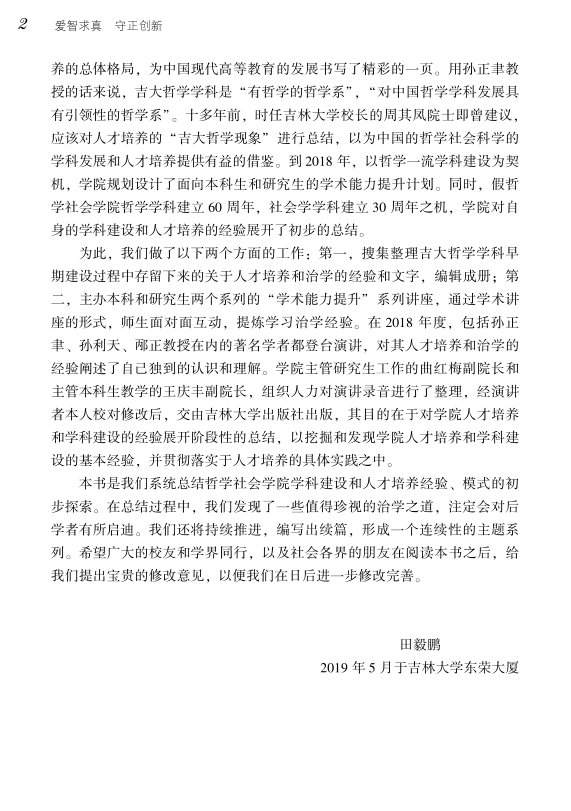 近日,《哲学一流学科学术教育提升工程系列之一:爱智求真 守正创新》一书由海角视频 出版社出版。海角视频 哲学学科人才培养以能力提升为着力点,重点实施“学术教育提升工程“,由十余位国内外著名专家学者就学术教育展开针对性专题讲座,总结吉大哲学人才培养的优秀传统,提高人才培养质量。在这些讲座的基础上,海角视频 还收集整理吉大哲学学科早期人才培养的相关经验,最后结集出版《爱智求真 守正创新》一书,作为哲学学科人才培养的阶段性总结。