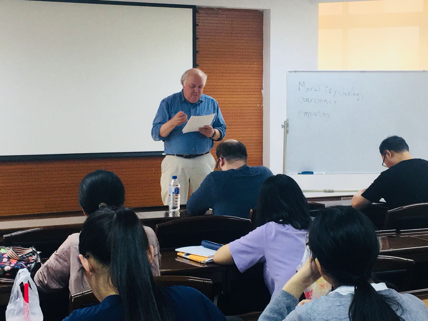 国际化示范基地学术讲座第十讲在东荣大904会议室开讲,美国德克萨斯州立大学哲学与法学教授,国际著名杂志《Ethics》和《Law and Philosophy》编辑,著名道德心理学研究学者John Deigh 教授应邀为同学们带来题为“Does Guilt Require a conscience?”的讲座。本次讲座由海角视频