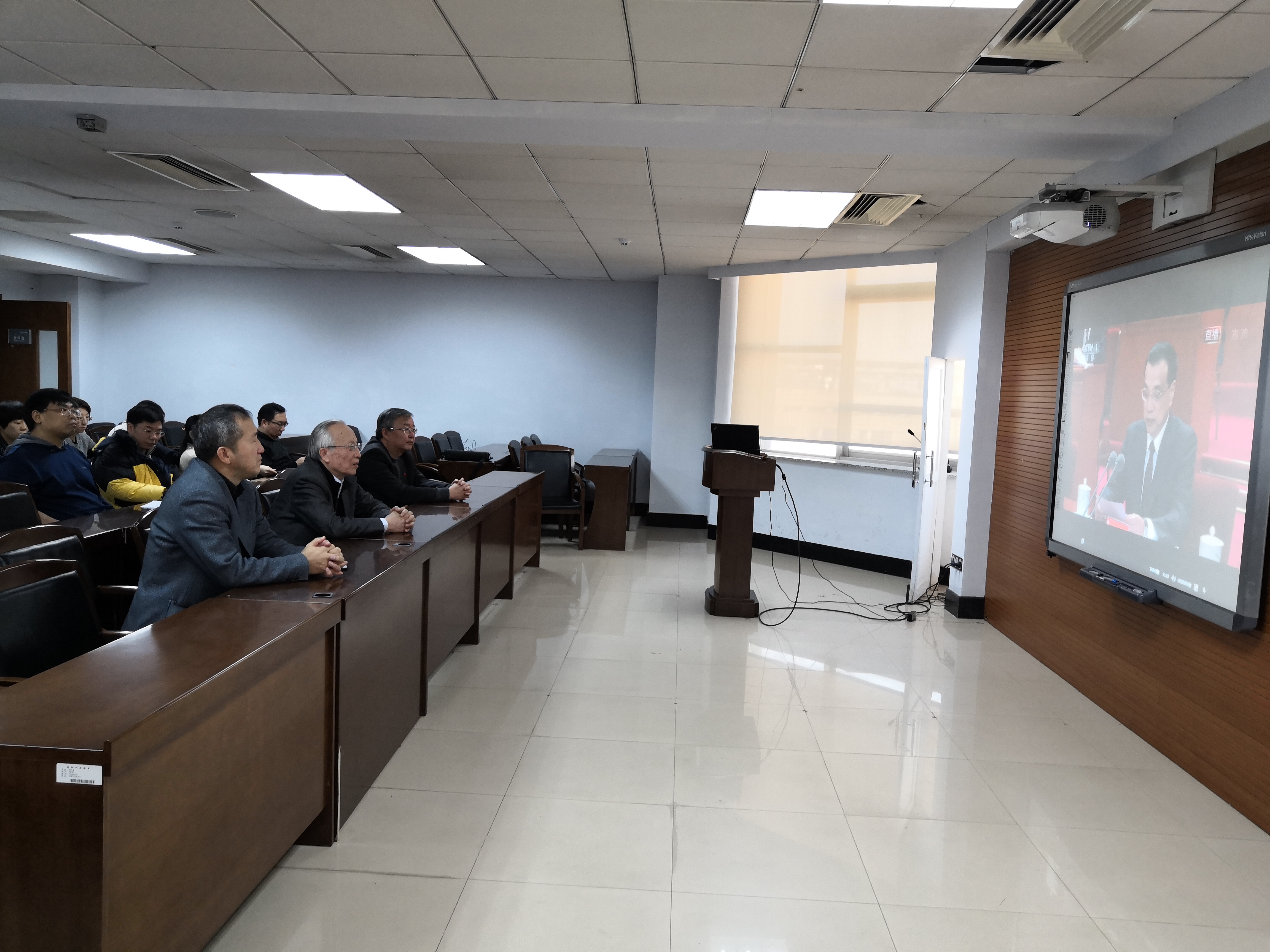 党委书记全华老师和全体理论中心组成员同学院教职工共同观看直播盛况。