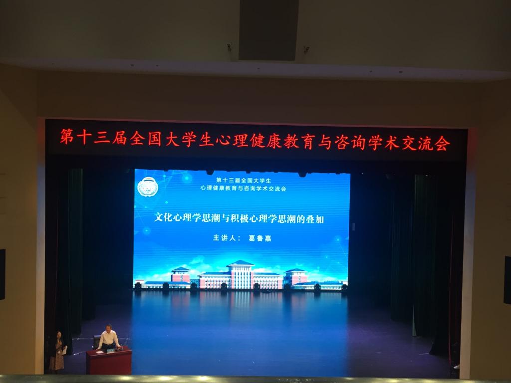 党委副书记冯正玉主持了会议。葛鲁嘉教授应邀在21日的大会上作了“文化心理学思潮与积极心理学思潮的叠加”的专题学术报告。报告指出了,心理健康教育的学术研究可以是针对接受教育的学生群体和提供教育的专家学者的现实目标、具体操作、基本工具、存在问题的,也可以是针对涉及心理健康教育的当代思潮、理论流派、核心学说、基本理论的。那么,在当代十余种流行的心理学思潮中,文化心理学思潮和积极心理学思潮则是相互叠加的对心理健康教育有着重大影响的学术研究和思想理论的潮流。因此,对此所进行的学术考察、研究探索、思想突破和理论创新,就成为推进我国大学生心理健康教育与咨询的非常重要的方面。文化心理学思潮是从无文化的心理学走向了有文化的心理学,积极心理学思潮是对传统心理学的消极面的积极地批判和转换。两种重要的心理学思潮形成了叠加,共同构成了促进心理健康教育的核心理念和学术资源。报告引起了与会者的重要反响和极大关注。