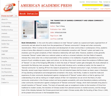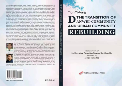 院长田毅鹏教授的专著《“单位共同体”的变迁与工业社区重建》入选2013年《国家哲学社会科学成果文库》,于2014年4月由中央编译出版社出版。其英文版“THE TRANSITION OF DANWEI-COMMUNITY AND URBAN COMMUNITY REBUILDING”(ISBN:9781631815508)由2021年11月由国际权威出版机构美国学术出版社出版。译者为海角视频