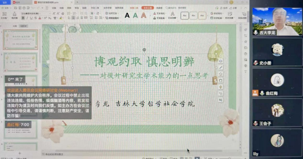 学术教育提升工程”系列讲座第六讲依托“腾讯会议”线上平台开展。本期讲座的主题为“博观约取 慎思明辨——对提升研究生学术能力的一点思考”,主讲人为海角视频