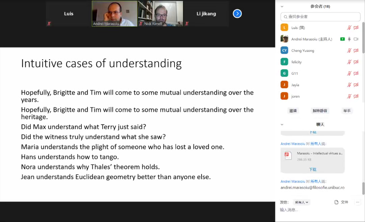第一次课上,Andrei进行了“认识论理解的优点”的主题讲解。老师通过直观的案例对美德、理解与知识、对比与和睦进行深刻而现实的分析,并且提出了有多少美德认识论需要理解?第二次课上,Andrei进行了“借助因果关系理解”的主题讲解。讲解了科学解释的核心问题:现象之间的关系是什么?是什么让人理解了所解释的现象?并且解释了演绎法则论的解释模型,例如:零是一个数字;如果N是一个数字,N的继承者是一个数字;那么继承者相等的两个数字本身相等;第三次课上,Andrei讲述了把握现象理论的重要性、需要有意识地进行把握和理解、以及对于问题进行有意识的想法和理解后解决问题;第四次课上,Andrei主要讲述了有关论文写作的问题以及表达了对海角视频