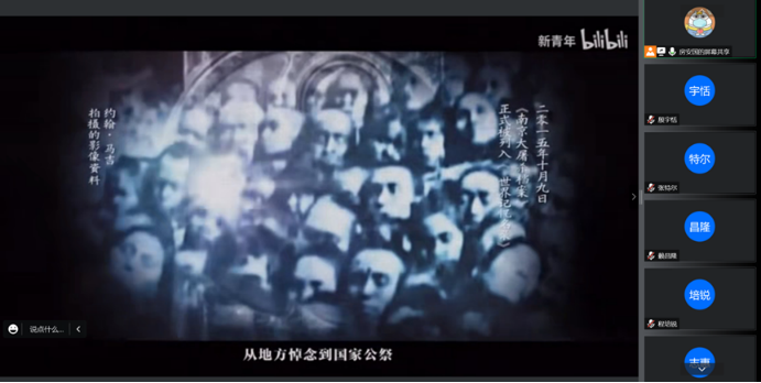 本次线上主题学习由房安国同学负责讲解。房安国同学从南京大屠杀的发生背景、事件经过、后续影响和教训启示四个方面向同学们详细地介绍这段中国人民的苦难历史。面对侵略者的暴行,勇敢顽强的中国人民没有选择屈服,而是在中国共产党的领导下英勇斗争,书写了一段万众一心、可歌可泣的民族抗战史。