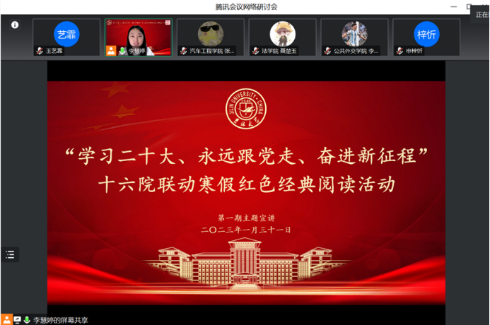 阅读经典,有助于我们客观清醒地学习中华优秀传统文化和社会主义先进文化,细致深刻地感悟党领导人民过去五年的工作和新时代十年的伟大变革,做到明理增信、崇德力行。在六位主讲同学和参会同学们的热情交流中,第一期寒假红色经典阅读活动圆满结束!