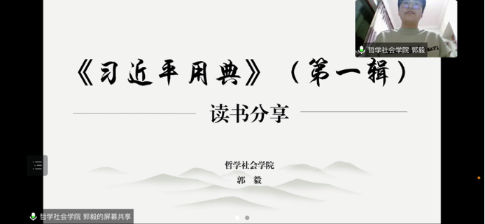 的郭毅同学向与会同学们介绍了阅读书籍中最打动她的三句名言,她感受到这每一个典故既富有其独特的韵味与乐趣,又富有深刻的内涵,指导着我们日常生活的方方面面。同时,郭毅同学鼓励大家在阅读时巧用图例,善做笔记,让抽象的知识变得清晰可见,有序回顾,定期复习,提高读书效率,认真领悟《习近平用典》一书中的经典语句和段落。