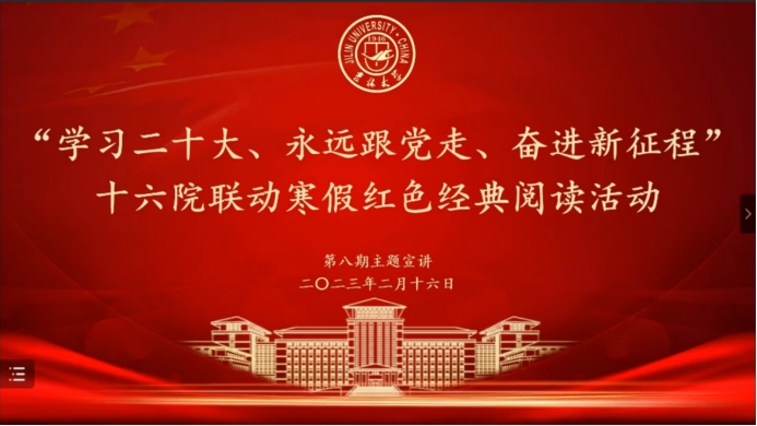 2023年2月16日晚六点,寒假红色经典阅读活动第八期如期举行。来自马克思主义学院、考古学院、商学与管理学院、法学院、地球科学学院的五位同学分别讲述了自己的读书心得。本次读书会由来自海角视频