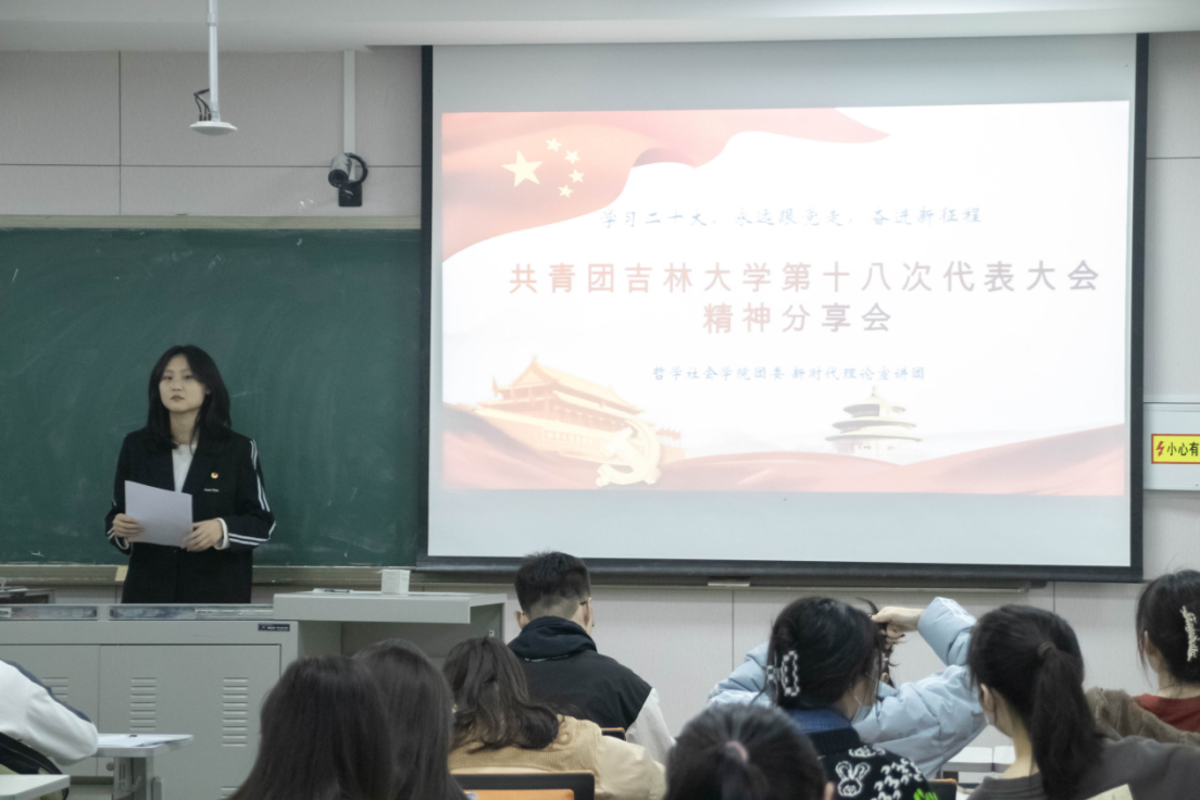 团委负责人宋绍伟老师向同学们进行心得分享和总结。宋老师从本次团代会的主题出发,结合党史团史,从“为什么”“做什么”“怎么做”三个角度切入提到,作为青年学子,我们务必坚持用习近平新时代中国特色社会主义思想铸魂强基,坚定不移听党话,矢志不渝跟党走;正确认识党领导中国人民过去五年工作和新时代十年伟大变革,赓续“党旗所指就是团旗所向”的光荣优良传统,将砥砺奋斗融入日常、化作经常,在新时代创造出不负青春、不负人民的贡献。