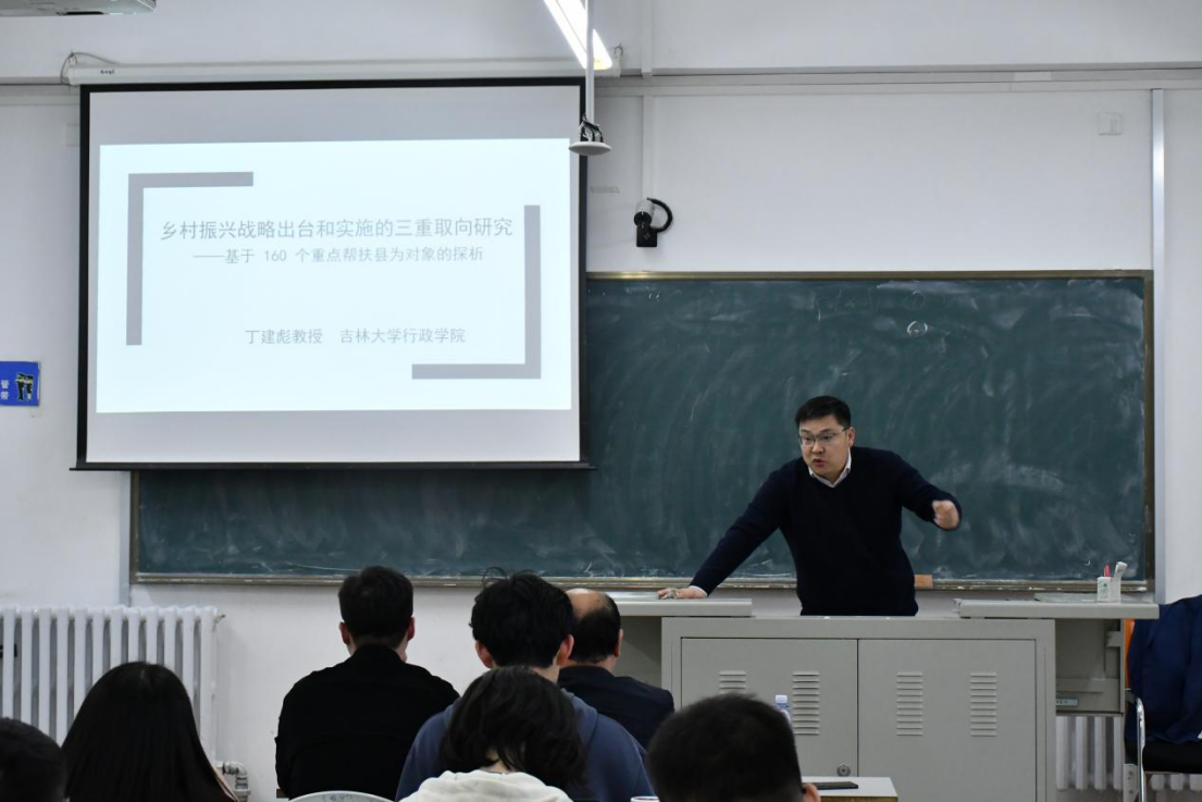 匡亚明青年学者、行政学院丁建彪教授以《乡村振兴战略出台和实施的三重取向研究——基于160个重点帮扶县为对象的探析》为题进行学术分享。在分享环节中,丁教授从乡村振兴的战略背景切入,基于160个重点帮扶县的田野调查经历总结,向同学们探讨了发展、公平和安全要素下的结构取向,展开论述了乡村振兴的空间和增长支持、群体团结感和社会凝聚力以及总体安全环境。