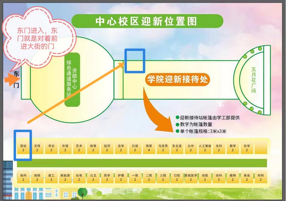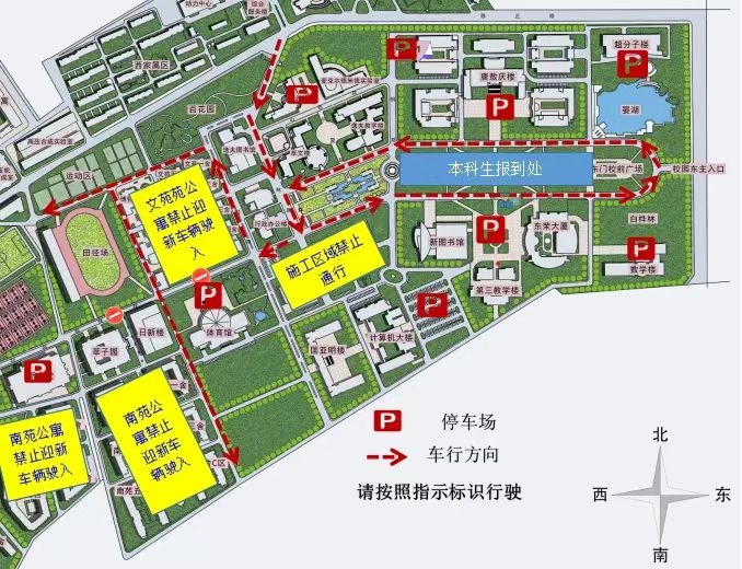 1.东门设为迎新主要出入口,车辆双向通行,除接送新生车辆外其他车辆禁行。