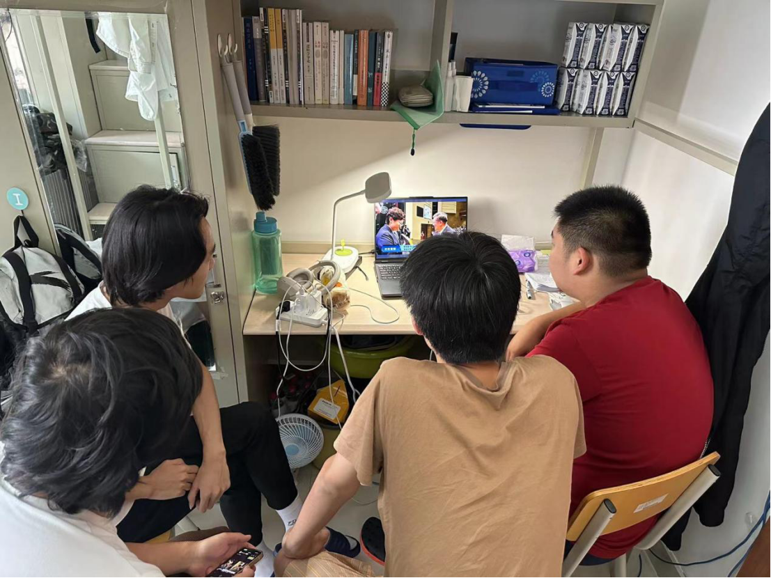 学子面貌昂扬、精神集中,在屏幕前认真观看现场直播。