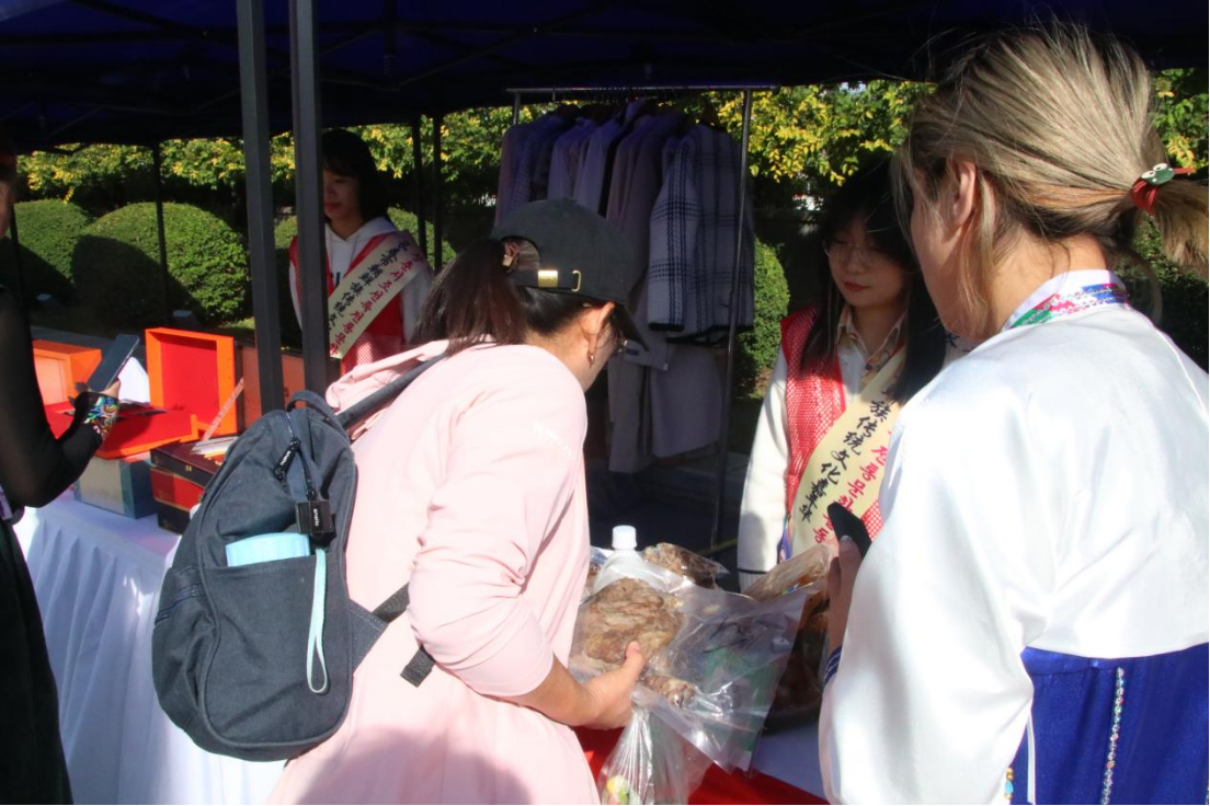 青年志愿者们在各摊位上,以饱满的精神面貌为大家细致介绍朝鲜族传统物质、文化产品,从美食、服饰到精美文创,无不浸润着朝鲜族人民数百年所积淀的文化气息。