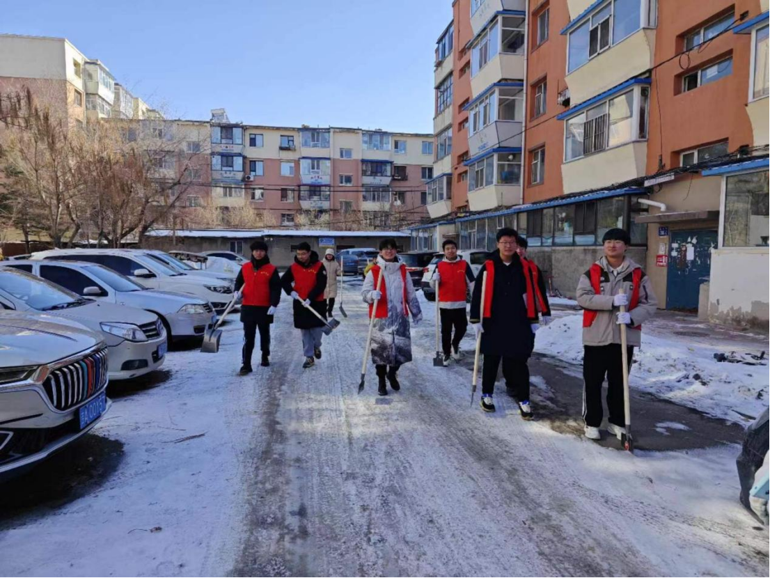 志愿者同学们统一身着红马甲,手戴白线手套,以积极饱满的精神风貌与高度负责的志愿精神开展志愿活动。走进社区,同学们在社区负责人的带领下领取工具,对小区内部影响美观的枯枝落叶、积雪和垃圾进行了深入的清理与打扫。