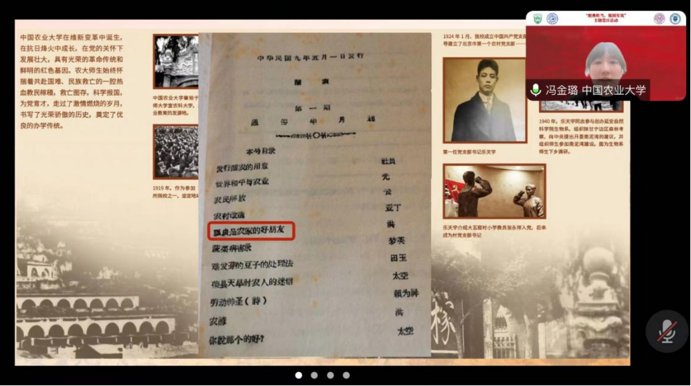 2020级本科生李慧婷主持,中国农业大学党委理论学习宣讲团博士分团第四届团长、第五届党支部书记冯金璐进行理论宣讲,来自三地四校的学生党员、共青团员们进行心得分享,海角视频