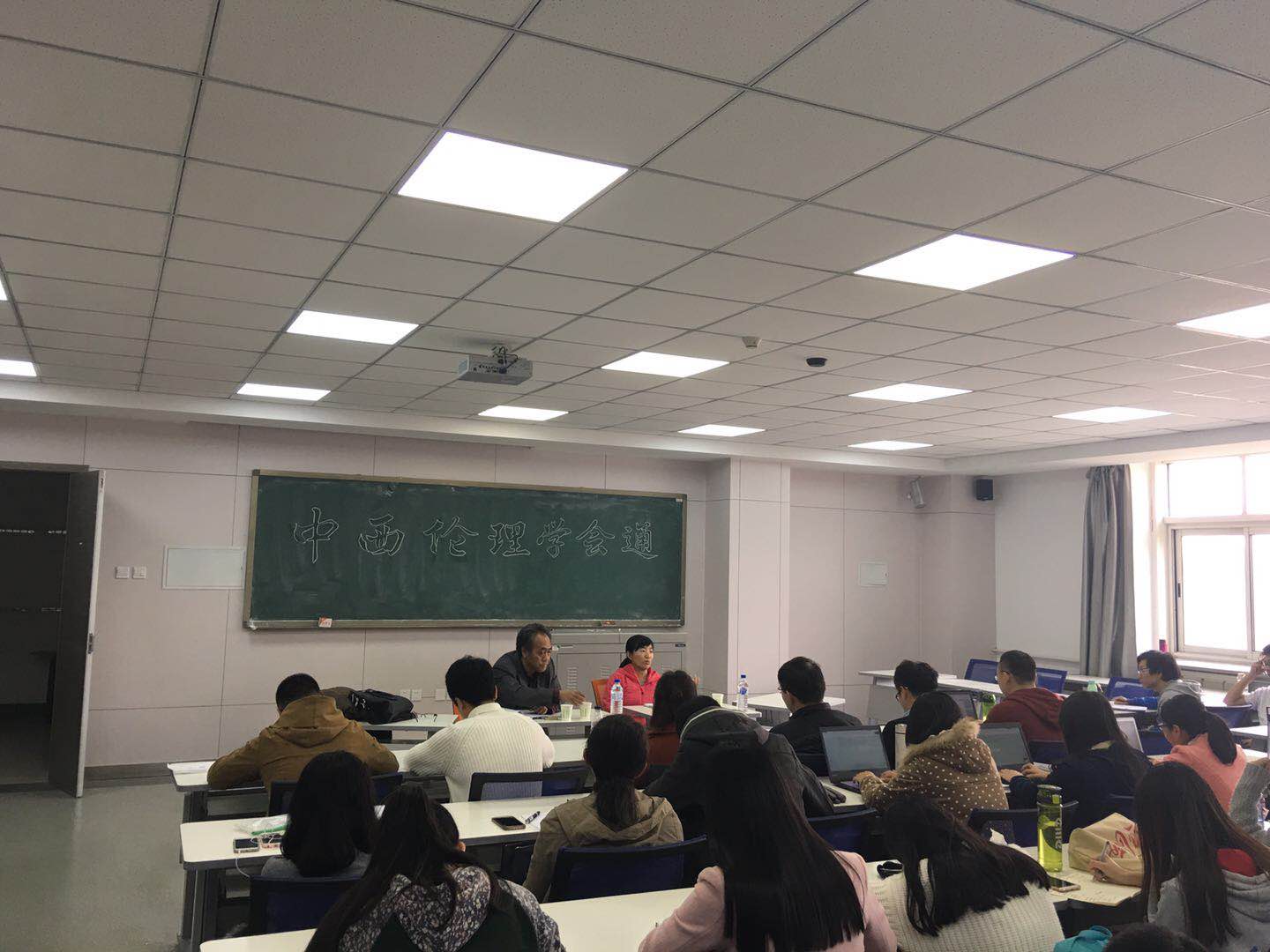 活动伊始,曲红梅老师提出了西方伦理学的三对概念——“伦理的”和“道德的”、“伦理学”和“道德哲学”以及“后果论”和“义务论”,她以这三对概念为线索,深入地向同学们介绍了西方伦理学的主要特点、发展脉络和经典论题。她的讲授风格明朗清晰,语言生动形象,用大量的例证、故事让同学们在具体的情境建构中感受到了伦理学的魅力。之后,刘连朋老师在对比中西方伦理思想的一柔一刚的鲜明特点后,引入了对中国传统伦理思想的介绍。他以中国历史发展为脉络,详细的介绍了中国伦理思想的演变过程。刘老师首先提到了中国以“礼、义、廉、耻”为代表的传统美德,并以原始宗教和人文道德为视角,分析了这种美德的来源。他从中国传统对维系大家族轨道的重视,谈到了中国社会的伦理本位性和中国人尽义务而不主张权利的性格特点。活动最后,在场学生向两位老师提问,老师们对包括儒家伦理、理欲关系和传统道德义务来源等问题进行了细致的解答。