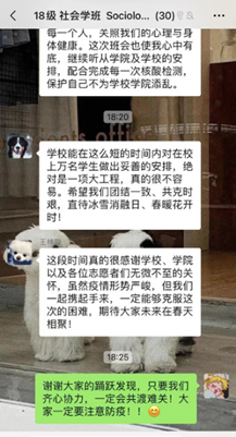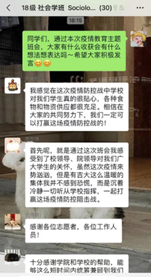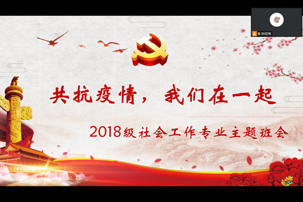 18级社工班由团支书崔荣敏同学提醒同学们要注意做好防护,积极配合防疫人员的各项工作安排,切实加强自身思想道德修养,及时观看青年大学习;然后,班长宋绍伟同学就学校相关防疫政策向同学们进行了解释,并提醒同学们要及时关注权威信息发布,坚决做到“不信谣、不传谣”,在疫情防控期间遇到困难一定要及时向老师们反映,科学防疫、合理求助;最后,学委张若晗同学向大家解释了有关毕业季教务方面的问题,并督促大家认真完成毕业论文的写作。