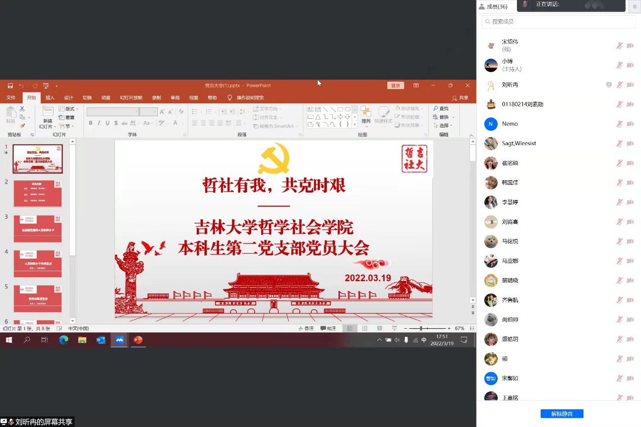 本科生第二党支部会议于3月19日18时在线上召开,本次会议由18级本科生刘昕冉同志主持,第二党支部全体党员同志参会。大会由三部分组成,第一部分主题为“尽锐出战,烈火真金”。首先由18级本科生宋绍伟同志宣读在抗击疫情期间表现优秀、新接收的入党积极分子人员名单;然后,由入党积极分子20级本科生张家仪同志做表态发言,张家仪同志代表全体入党积极分子表示,感谢党组织的关心爱护,在接下来,将以更加饱满的热情投身到抗击疫情的志愿服务中,积极奉献,争做先锋。