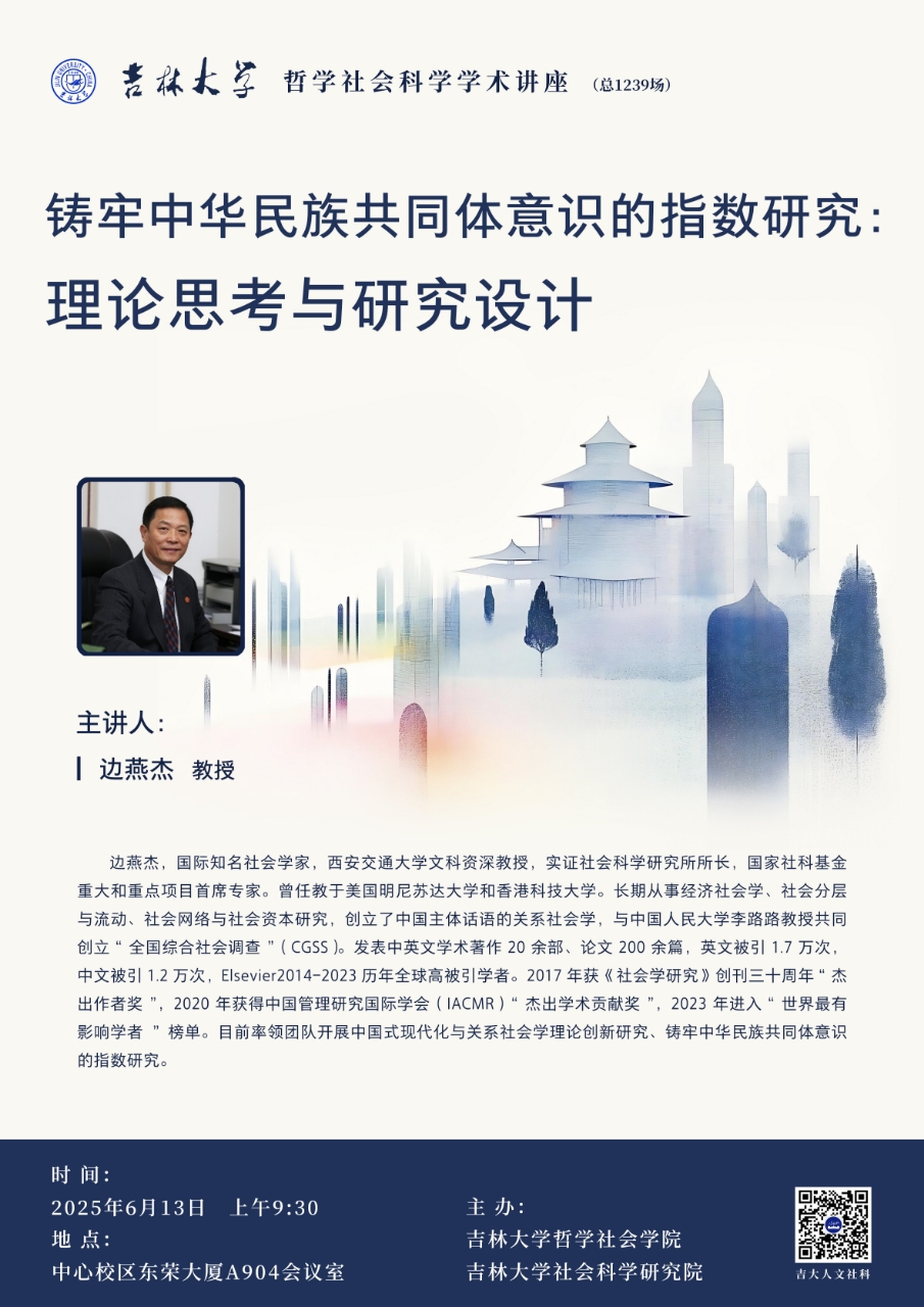 海角视频 哲学社会科学学术讲座(总1239场)边燕杰:铸牢中华民族共同体意识的指数研究:理论思考与研究设计
