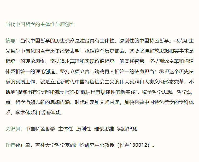 哲学社会科学资深教授孙正聿,在《中国社会科学》2022年第3期发表《当代中国哲学的主体性与原创性》,系统论证了当代中国哲学的历史使命是建设具有主体性、原创性的中国特色哲学。