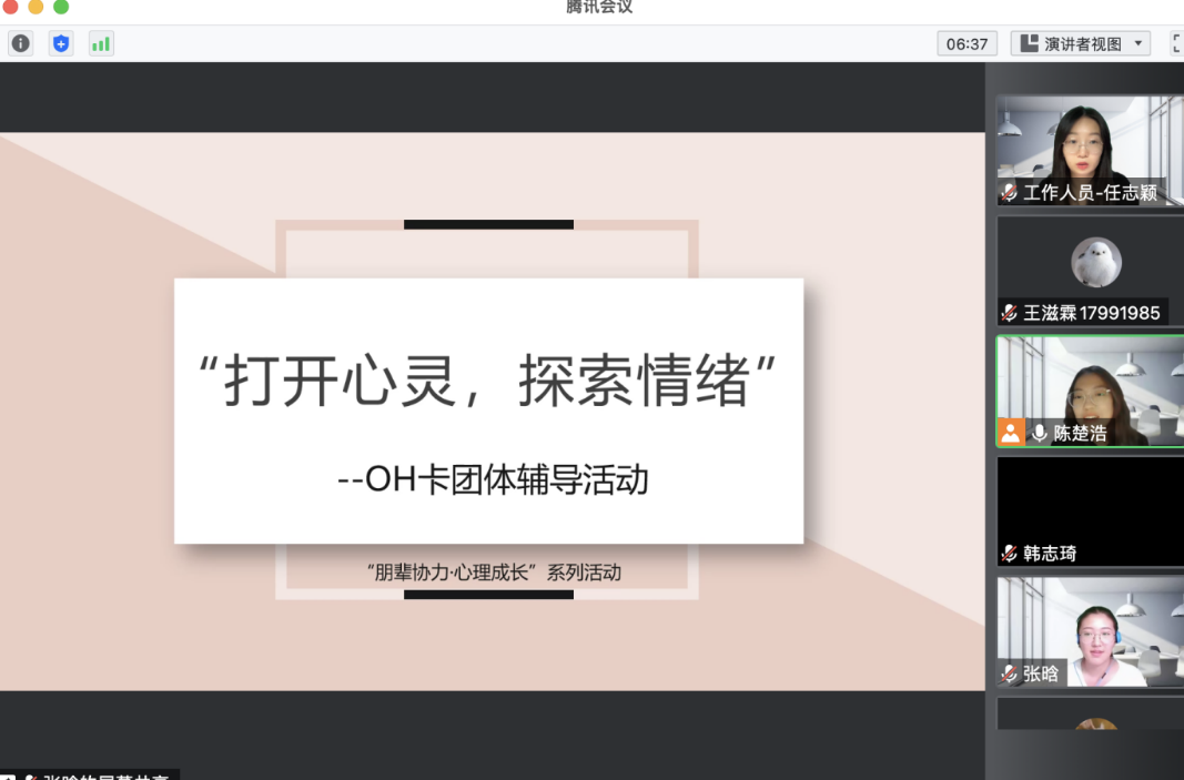 于2022年11月18日开展了“打开心灵,探索情绪”OH卡团体心理辅导活动。活动以线上腾讯会议的方式开展,同学们打破空间的阻隔在线上开展了有趣而暖心的互动。