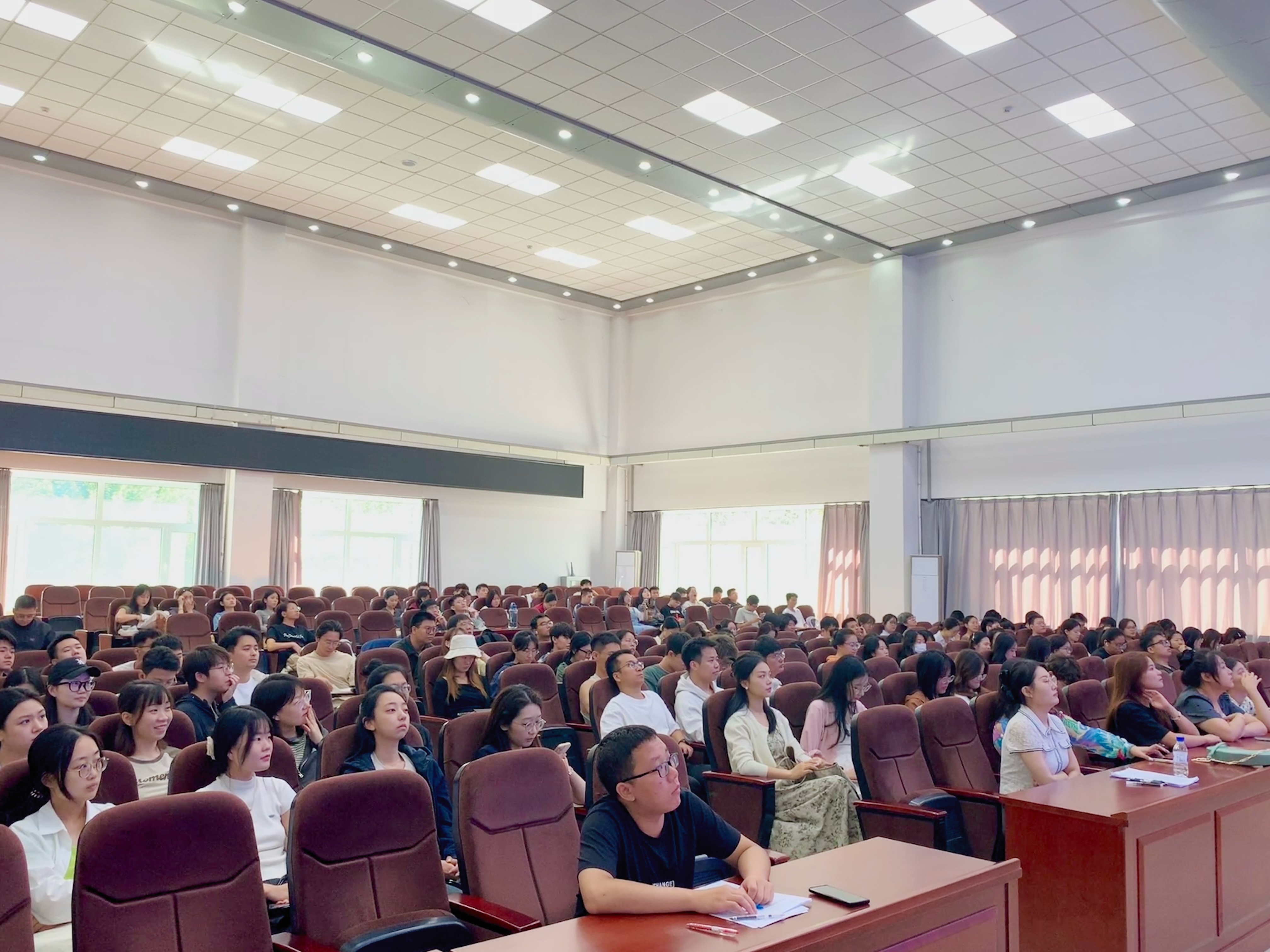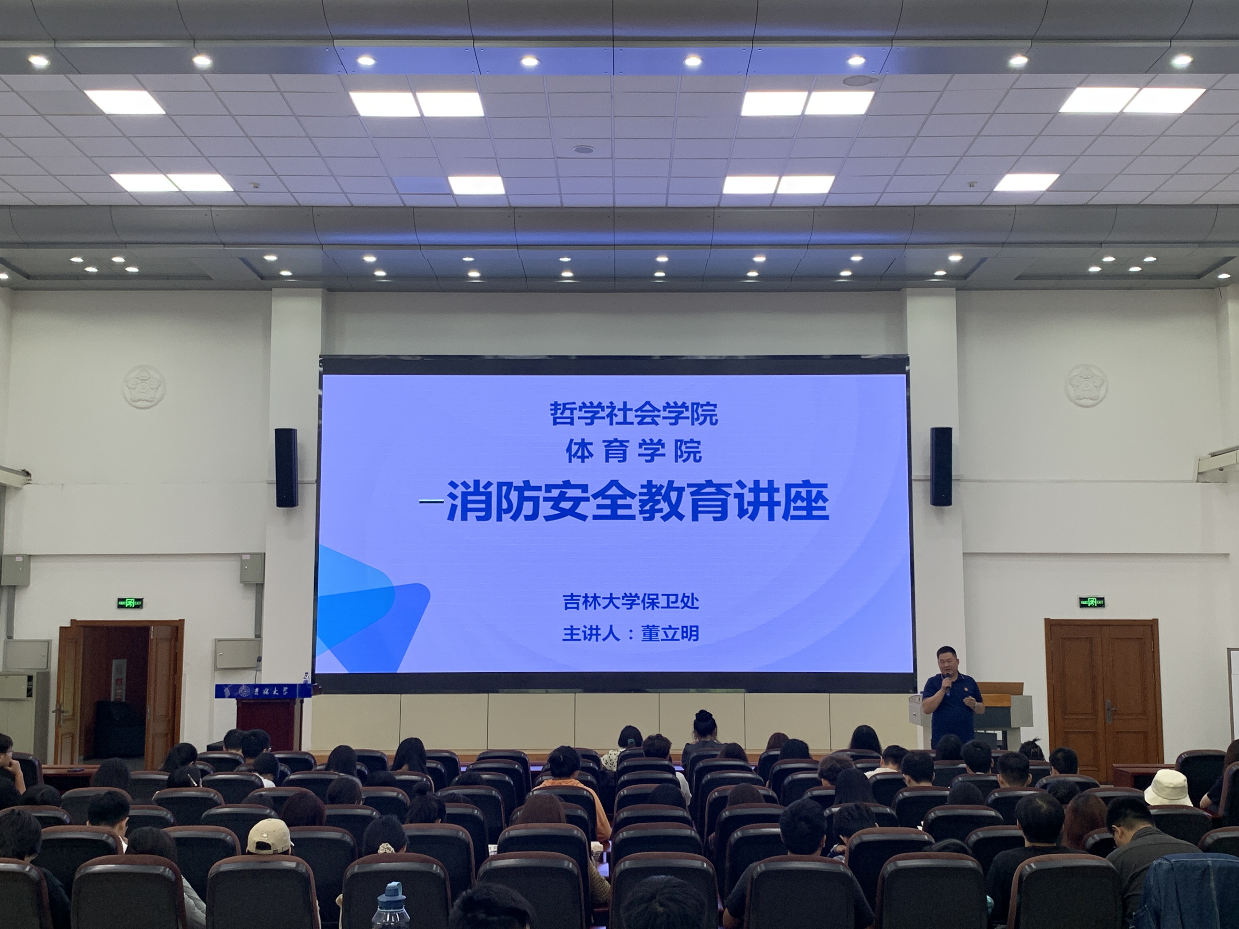 保卫处治安科副科长卢阳老师与消防科副科长董立明老师主讲,研究生辅导员于洋老师、2024级全体博士硕士新生和其他年级研究生代表参加讲座。