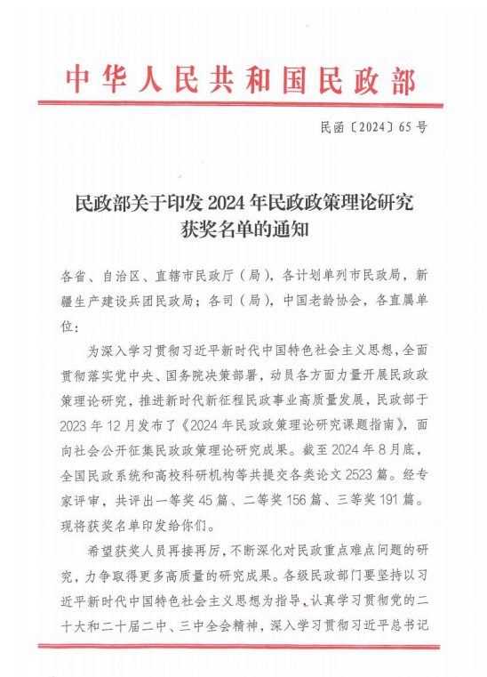 为深入学习贯彻习近平新时代中国特色社会主义思想,全面贯彻落实党中央、国务院决策部署,动员各方面力量开展民政政策理论研究,推进新时代新征程民政事业高质量发展,民政部于2023年12月发布了《2024年民政政策理论研究课题指南》,面向社会公开征集民政政策理论研究成果。本院学生积极参与此次活动。2024年11月1日,中华人民共和国民政部发布了关于印发2024年民政政策力量研究获奖名单的通知,海角视频