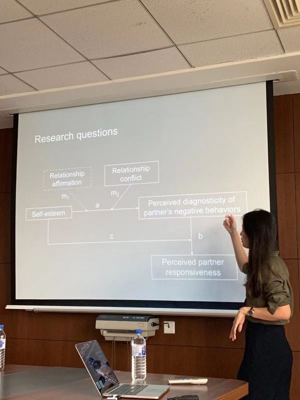 于2019年7月1日下午在东荣大厦908室举办了“新锐学者系列”讲座。来自香港中文大学心理学系的李斯斯博士做了题为 “Flashing Red Light: Perceiving the Diagnosticity of Partner’s Negative Behaviours”的英文讲座。讲座内容是有关自尊影响个体对亲密关系伴侣的消极行为所感知到的诊断性。李斯斯博士首先提出了“自尊社会计量器校准认知”假说:即在判断亲密关系伴侣对自我的接纳时,低自尊个体与高自尊个体相比,会将伴侣的消极行为视为具有更高的诊断性——这一过程被视为是(低)自尊作为社会计量器所表达的、针对缺乏亲密关系安全感的自我保护。之后,她逐一例举了自己在攻读博士学位期间开展的四个研究,来说明特质自尊与个体所感知到的诊断性之间的负相关关系。最后得出结论,即通过采用不同的研究设计与方法,都可以为“自尊社会计量器校准认知”假说提供一致的支持。