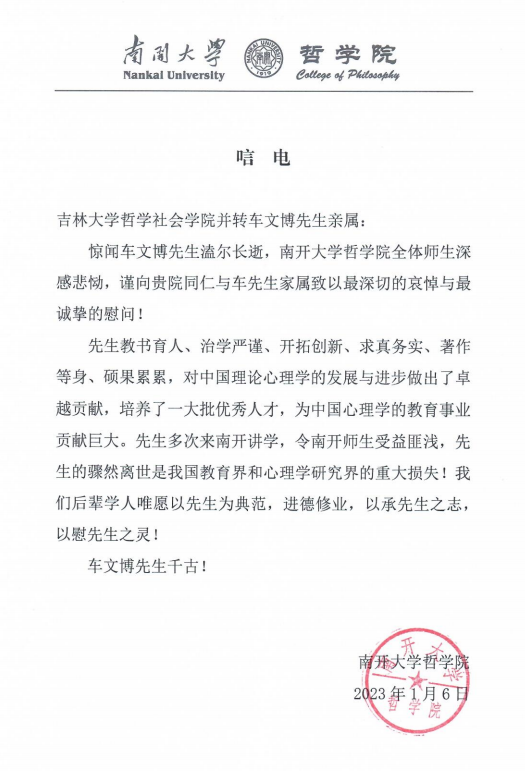南开大学哲学院唁电