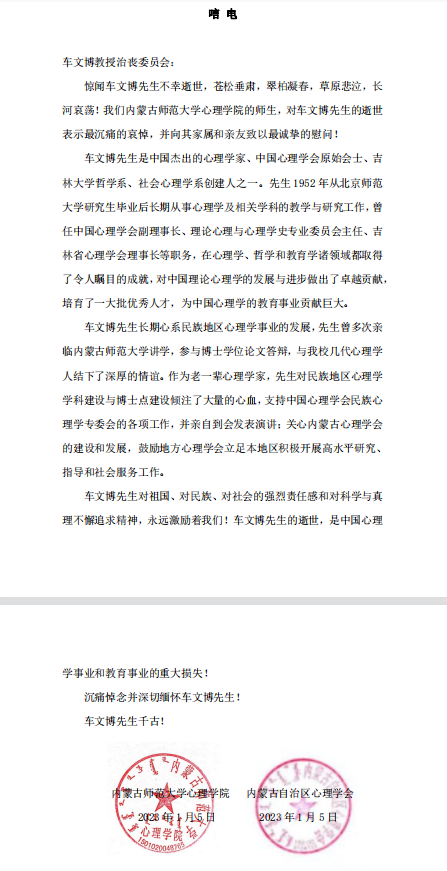 内蒙古师范大学心理学院、内蒙古自治区心理学会唁电