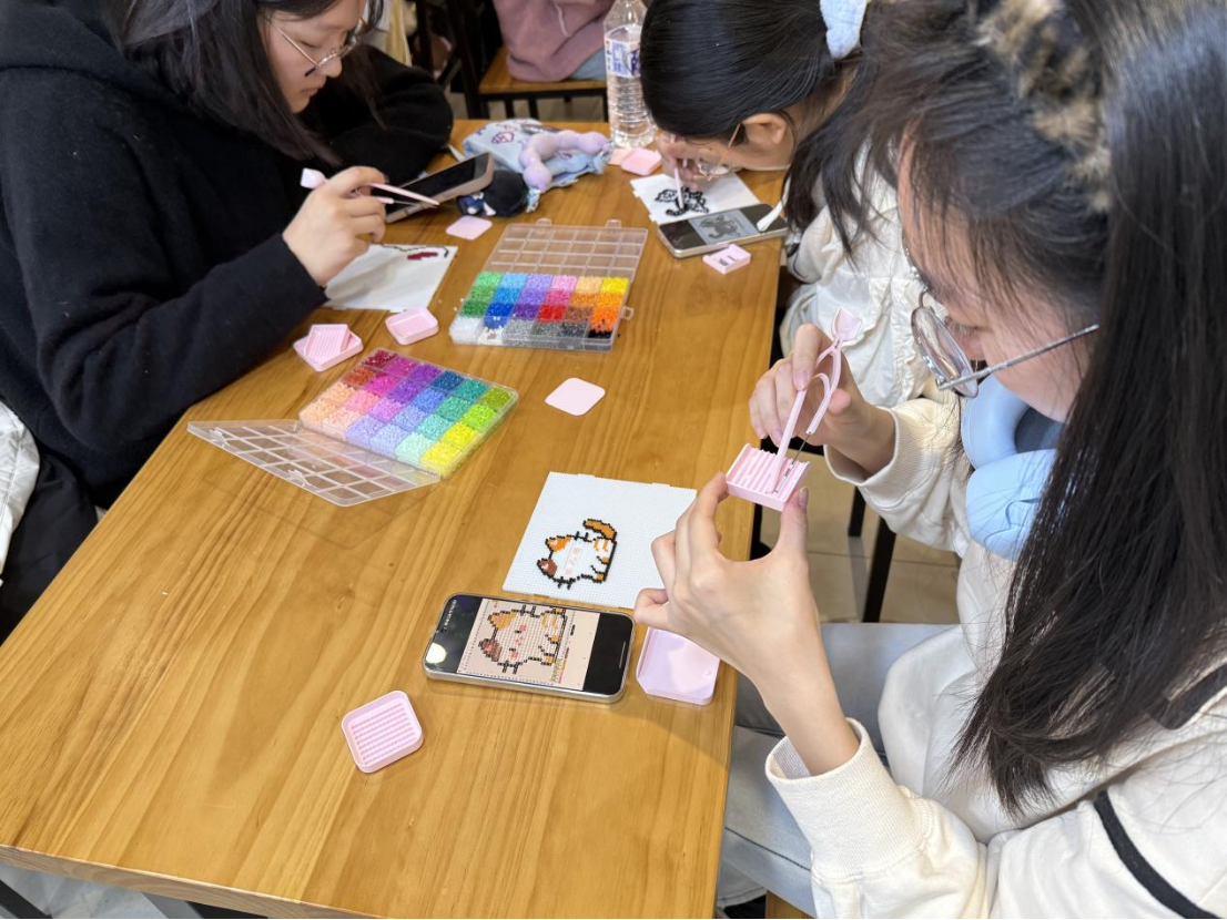 接下来,同学们纷纷投入到拼豆的制作中,大家先在网络上寻找了自己喜欢的样式,随后便拿起工具,沉浸在制作拼豆的乐趣之中。图案成型后,大家拿着熨斗小心烫熨,一个个独一无二的拼豆作品就此诞生。