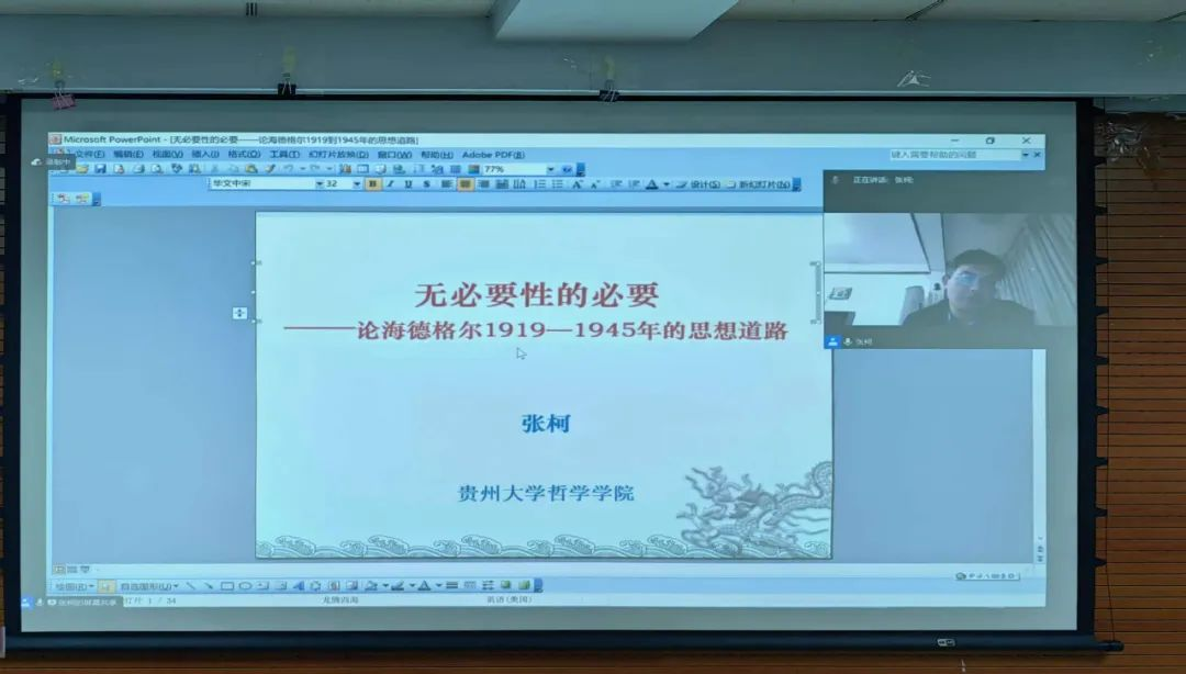 举办的德法哲学青年学者系列讲座第七讲在东荣大厦904举办。本期讲座由贵州大学哲学系张柯教授主讲,讲座主题为“无必要性的必要一一论海德格尔1919-1945年的思想道路”。同济大学人文学院张振华副教授担任与谈人和评论人。讲座由赵雄峰副教授主持。